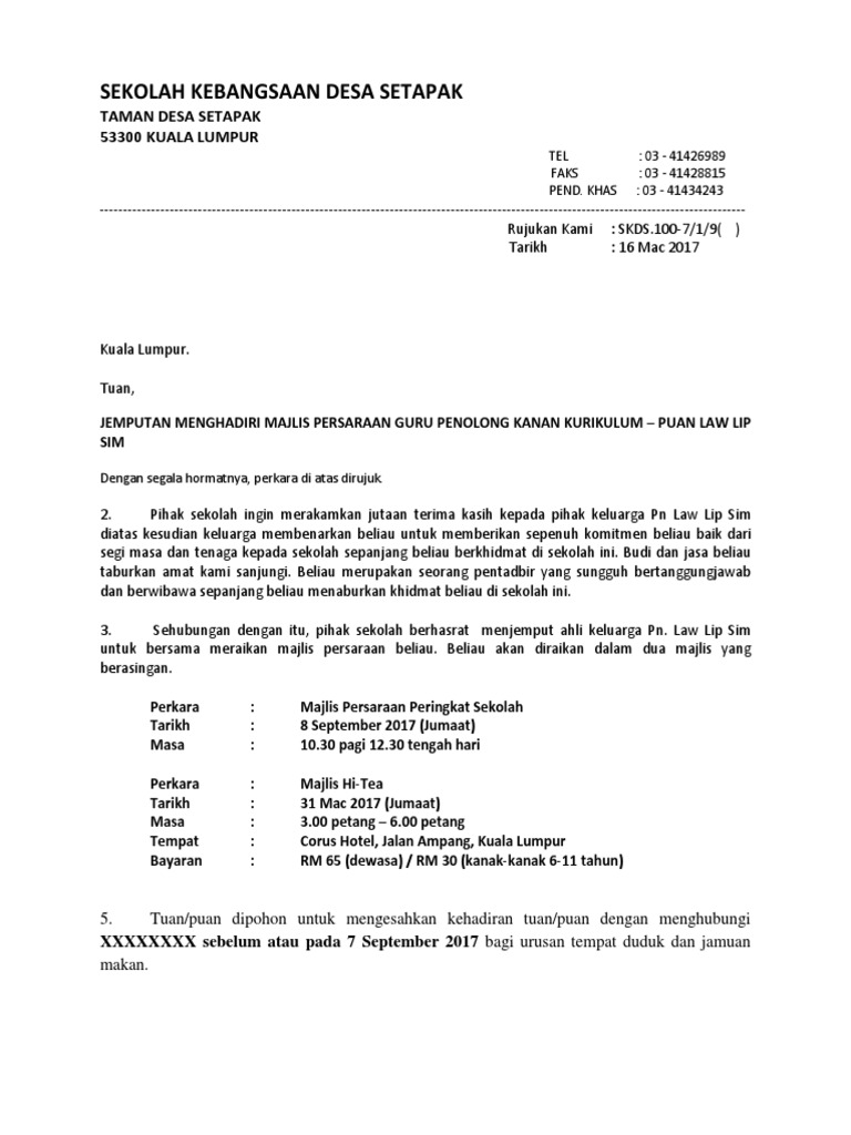 Contoh surat jemputan majlis persaraan guru besar have an image associated with the other. Attribution Non-Commercial BY-NC Format Tersedia. Berhormat contoh surat rasmi kepada yang berhormat menteri contoh surat.